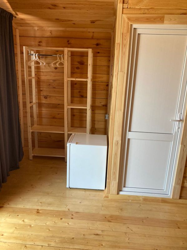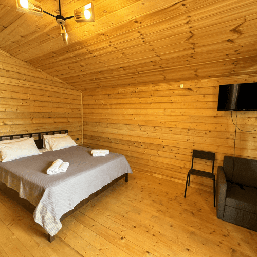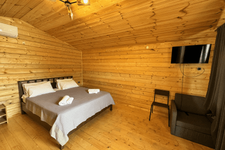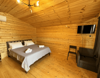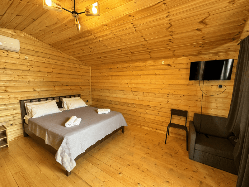 Отделка коттеджей выполнена из древесины. В комнатах установлены удобные кровати, есть телевизоры, кондиционеры, холодильники и собственные ванные комнаты с душевой кабиной и полотенцами.